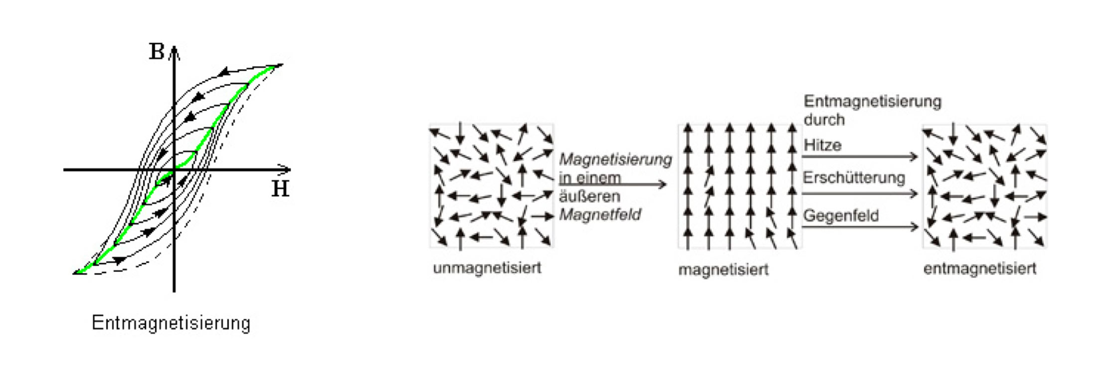 Eine Entmagnetisierung kann auch durch mechanische Erschütterungen oder durch Erhitzen des ferromagnetischer Materialien über die Curie-Temperatur hinaus bewirkt werden.