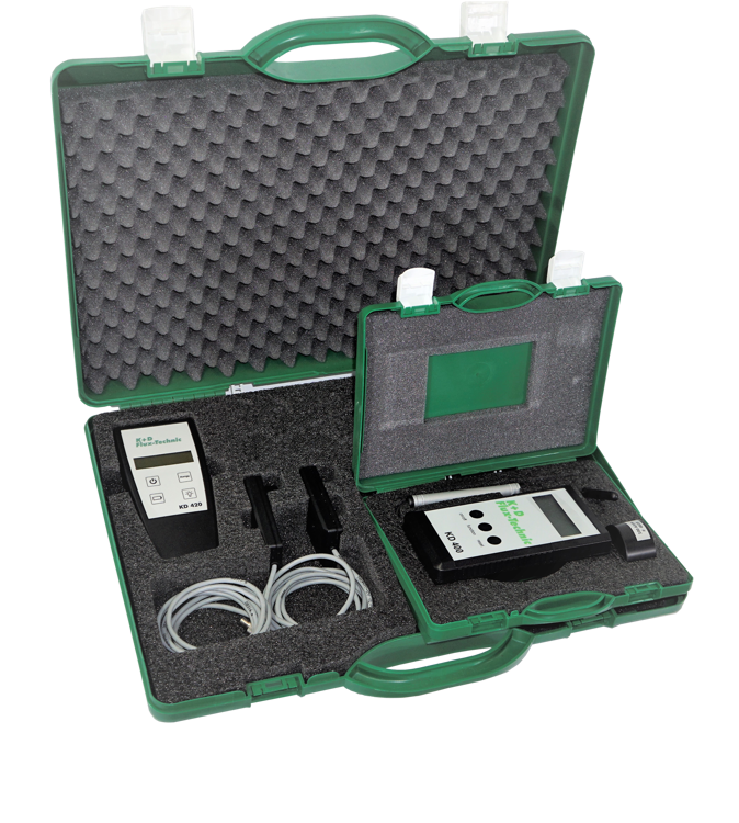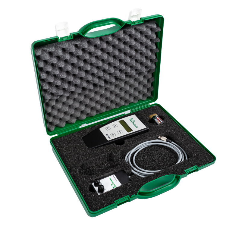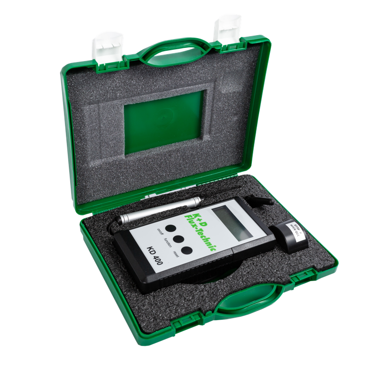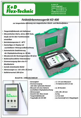 KD 400 field strength meter with tangential field probe and calibration standard.