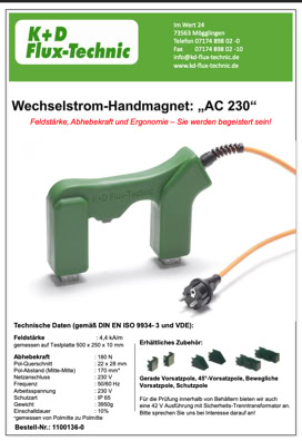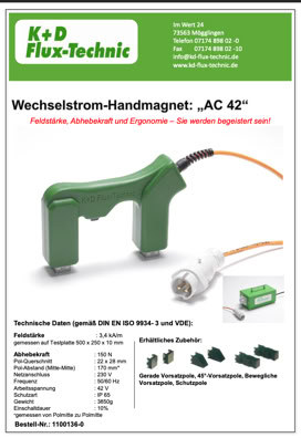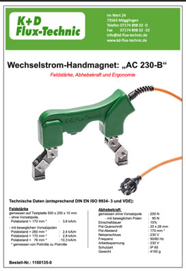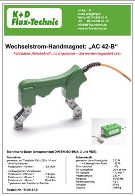 Field strength: 2.4 kA/m to 10.3 kA/m depending on the selected attachment poles. Measured on a test plate measuring 500 x 250 x 10 mm